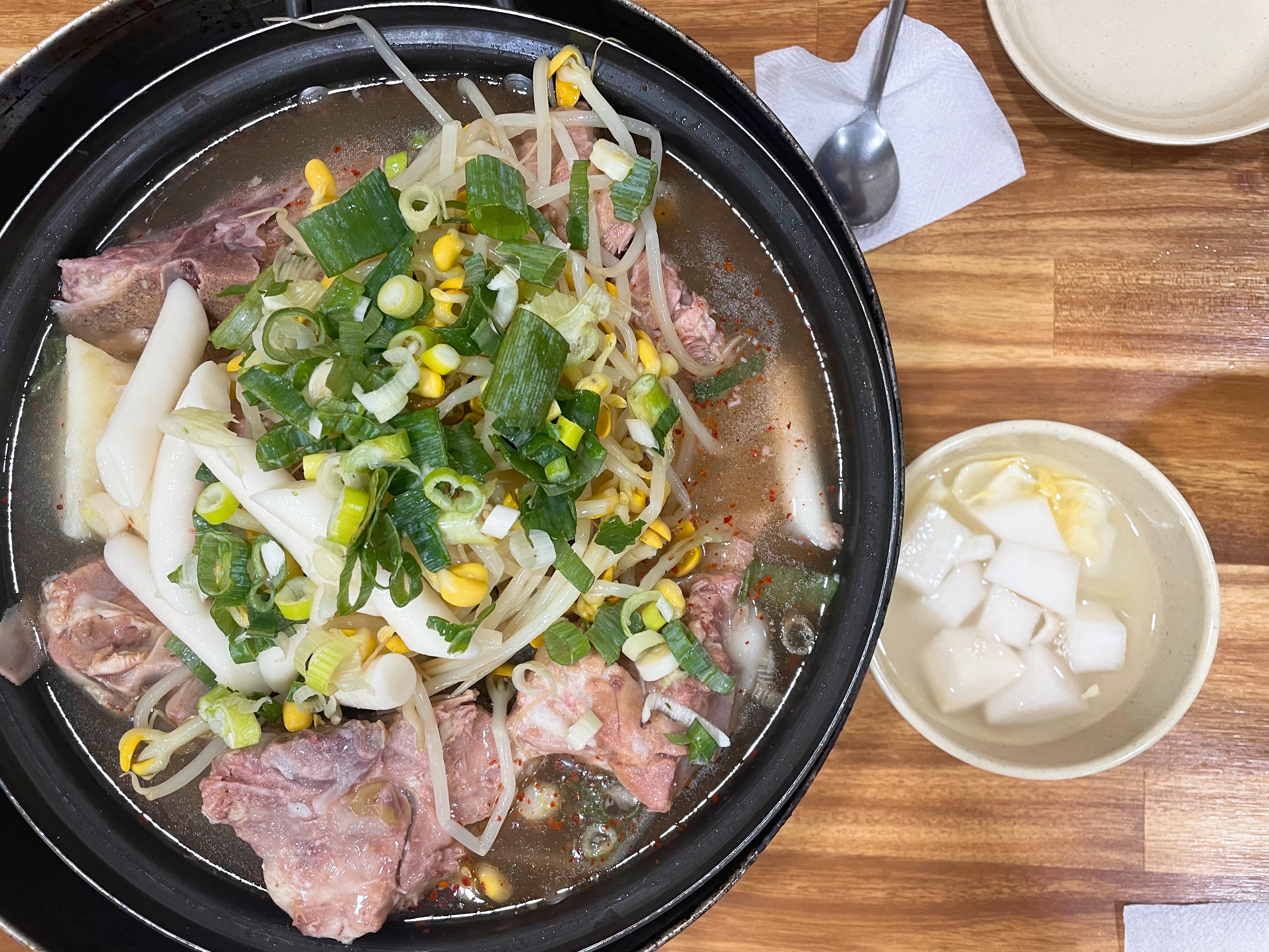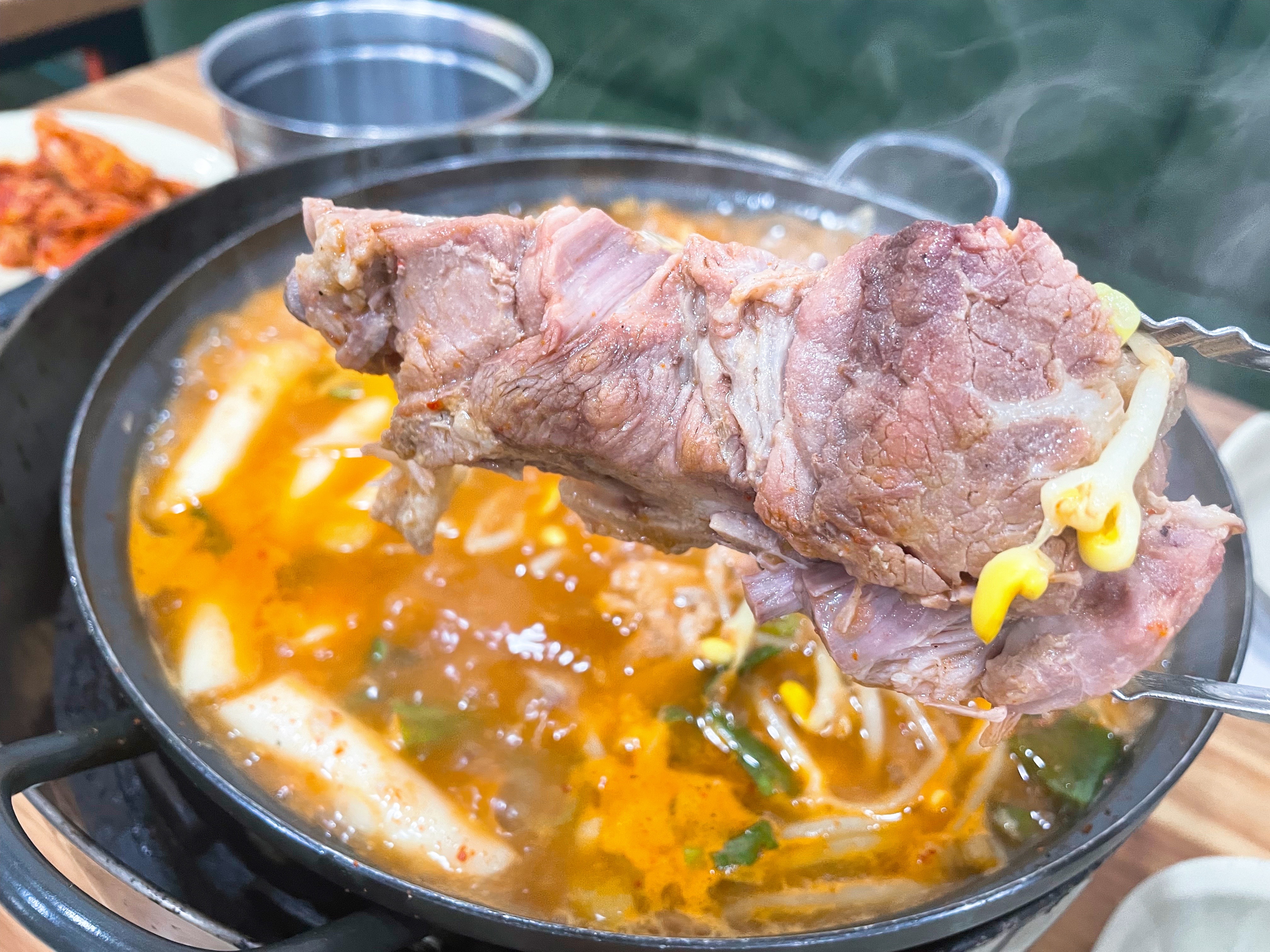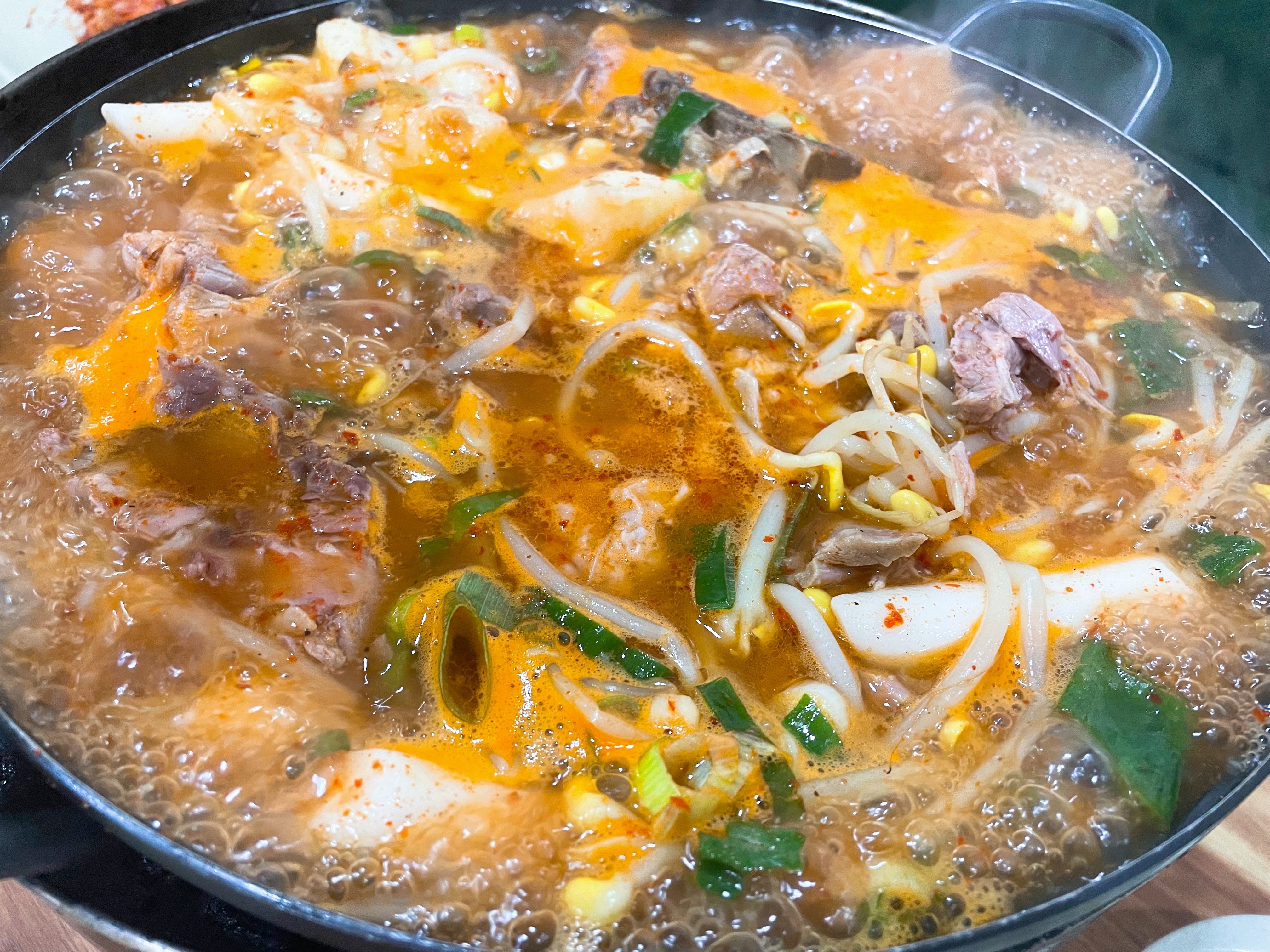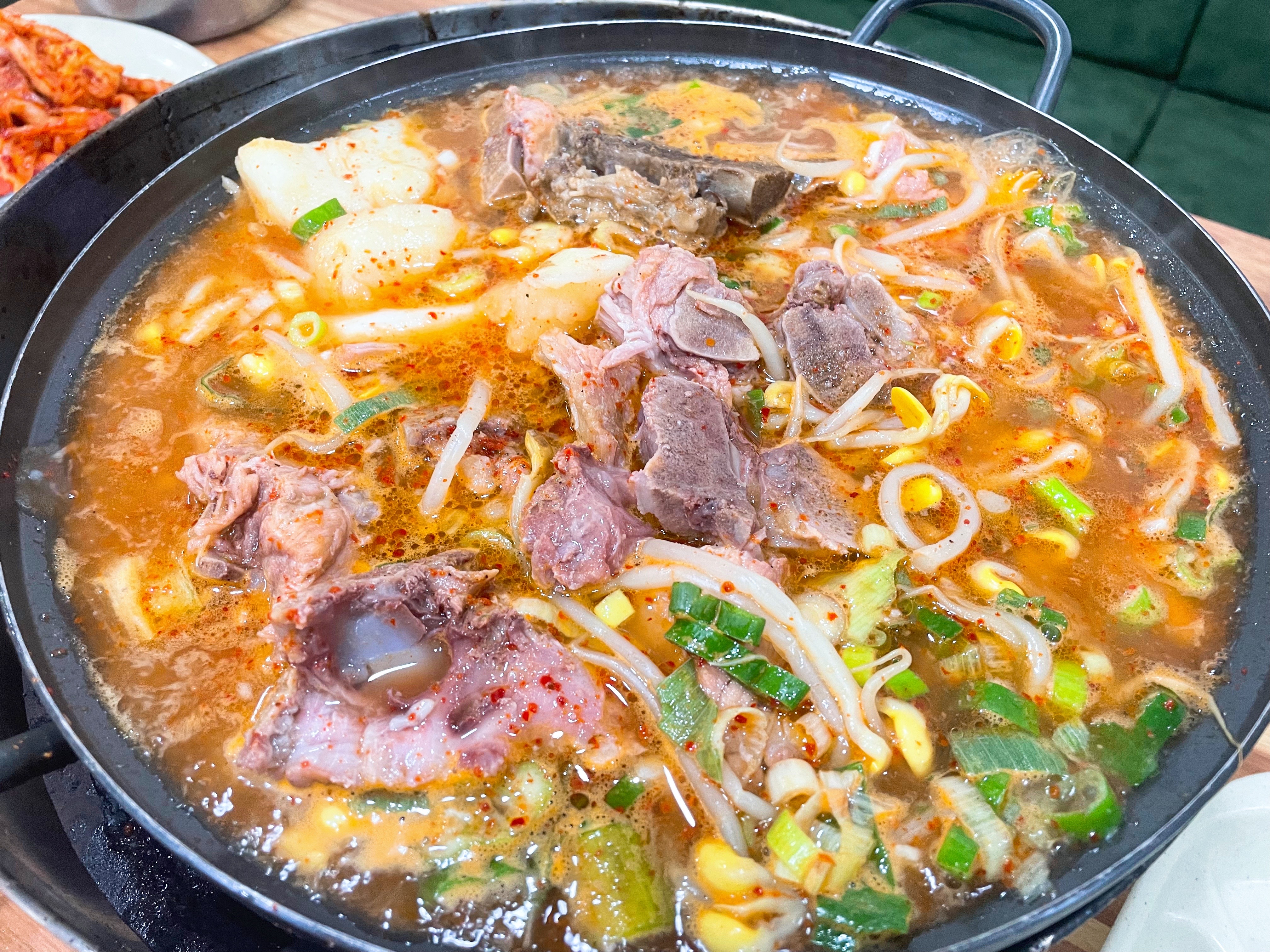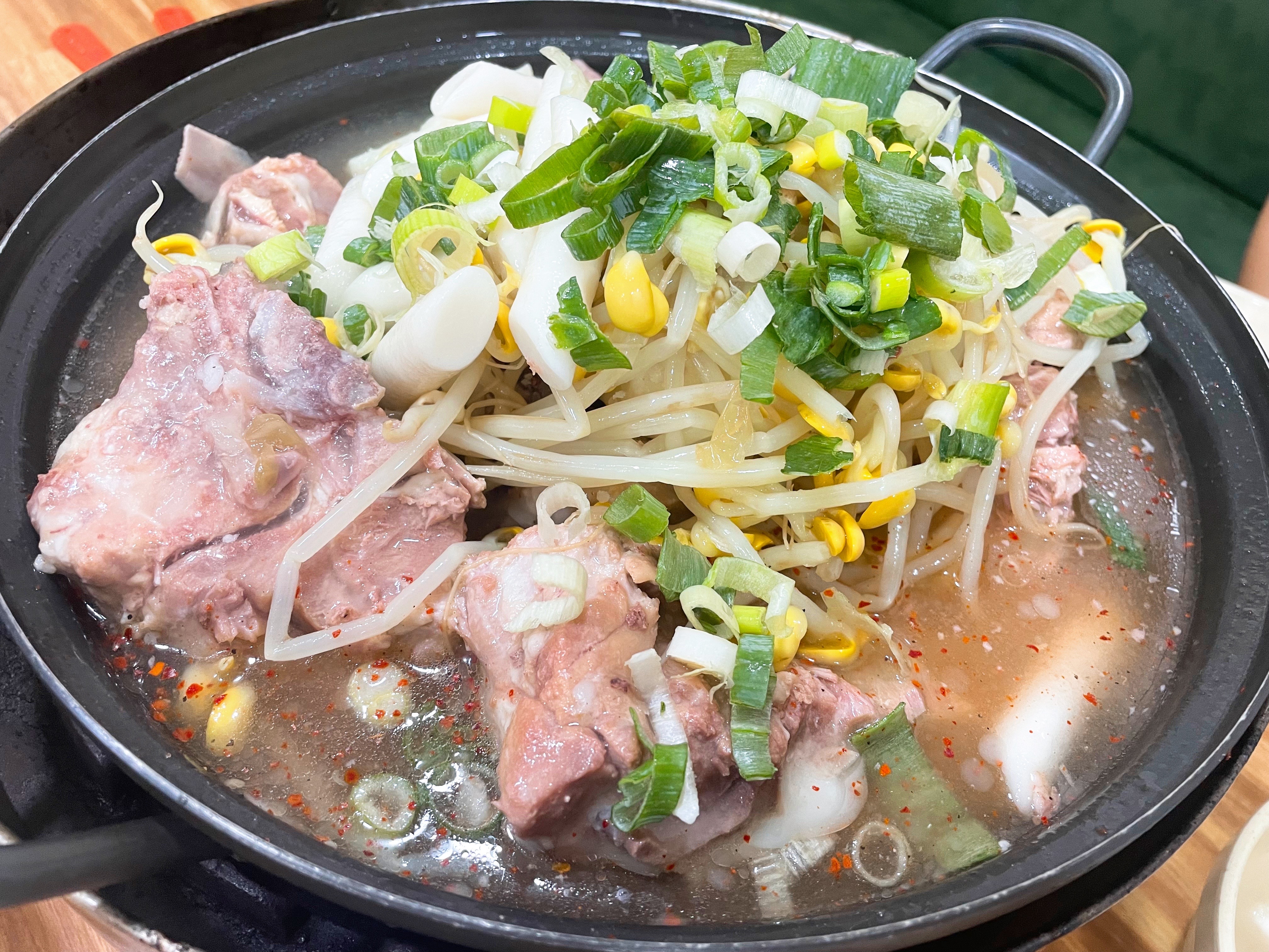 타사 감자탕과 달리 우거지가 없고 콩나물과 대파가 듬뿍 올라간다.
