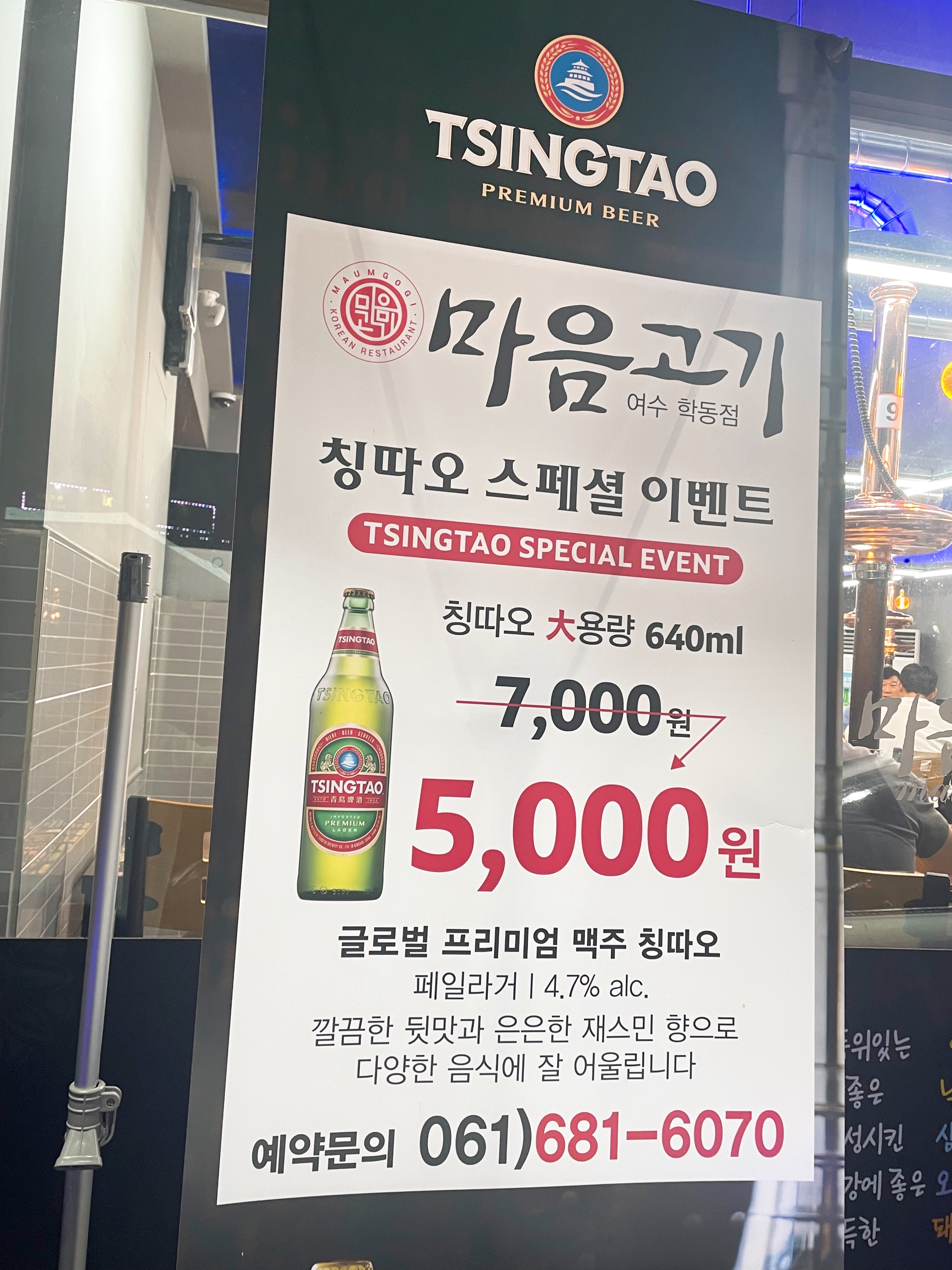 칭따오 대용량 640ml를 5,000원으로 할인 행사 하고 있다.