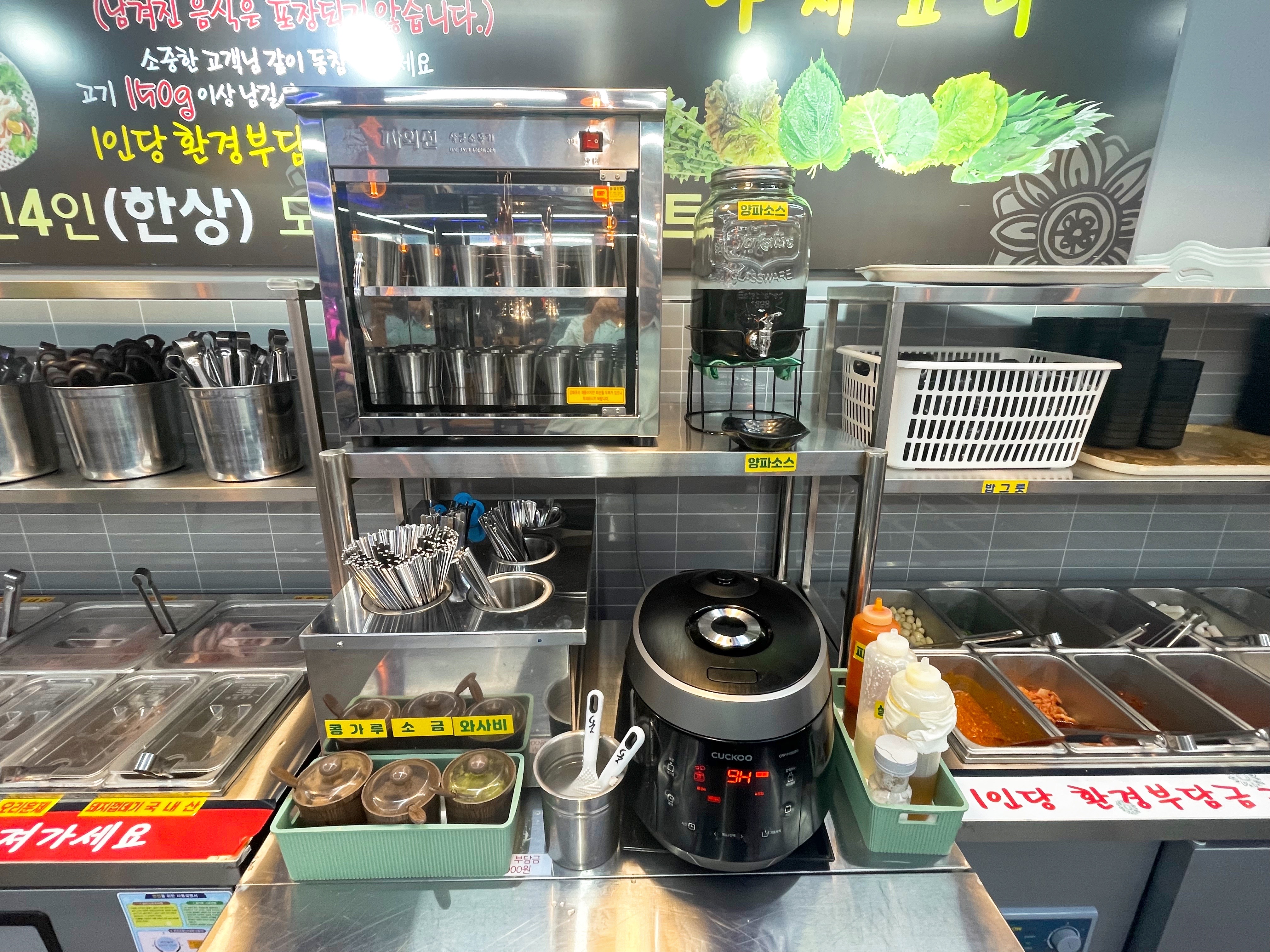 식기, 집게, 가위, 물컵, 양념소스 등 잘 정리가 되어 있다.