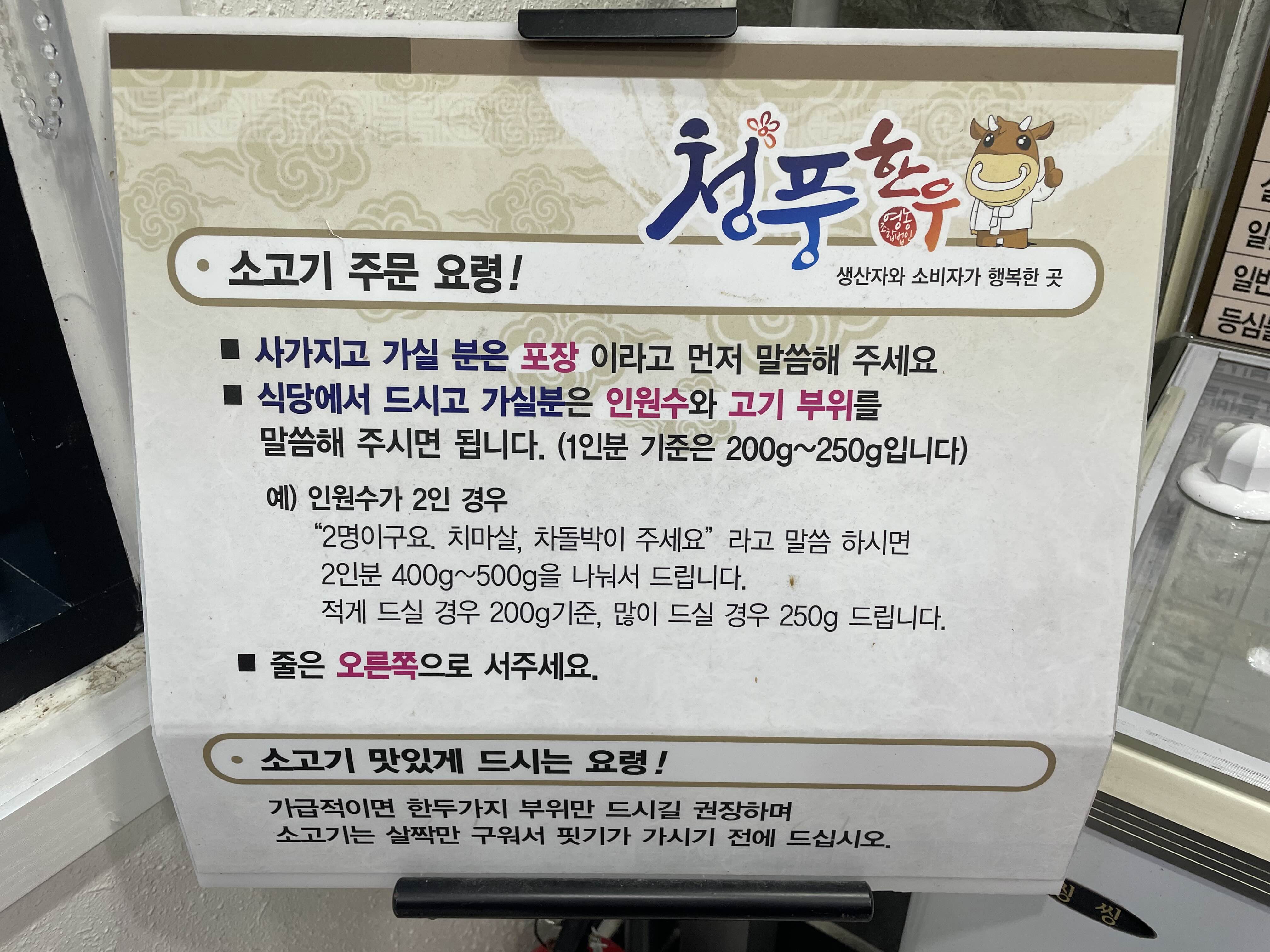 식당에서 먹고 가려면 인원수, 고기 부위를 말한다.