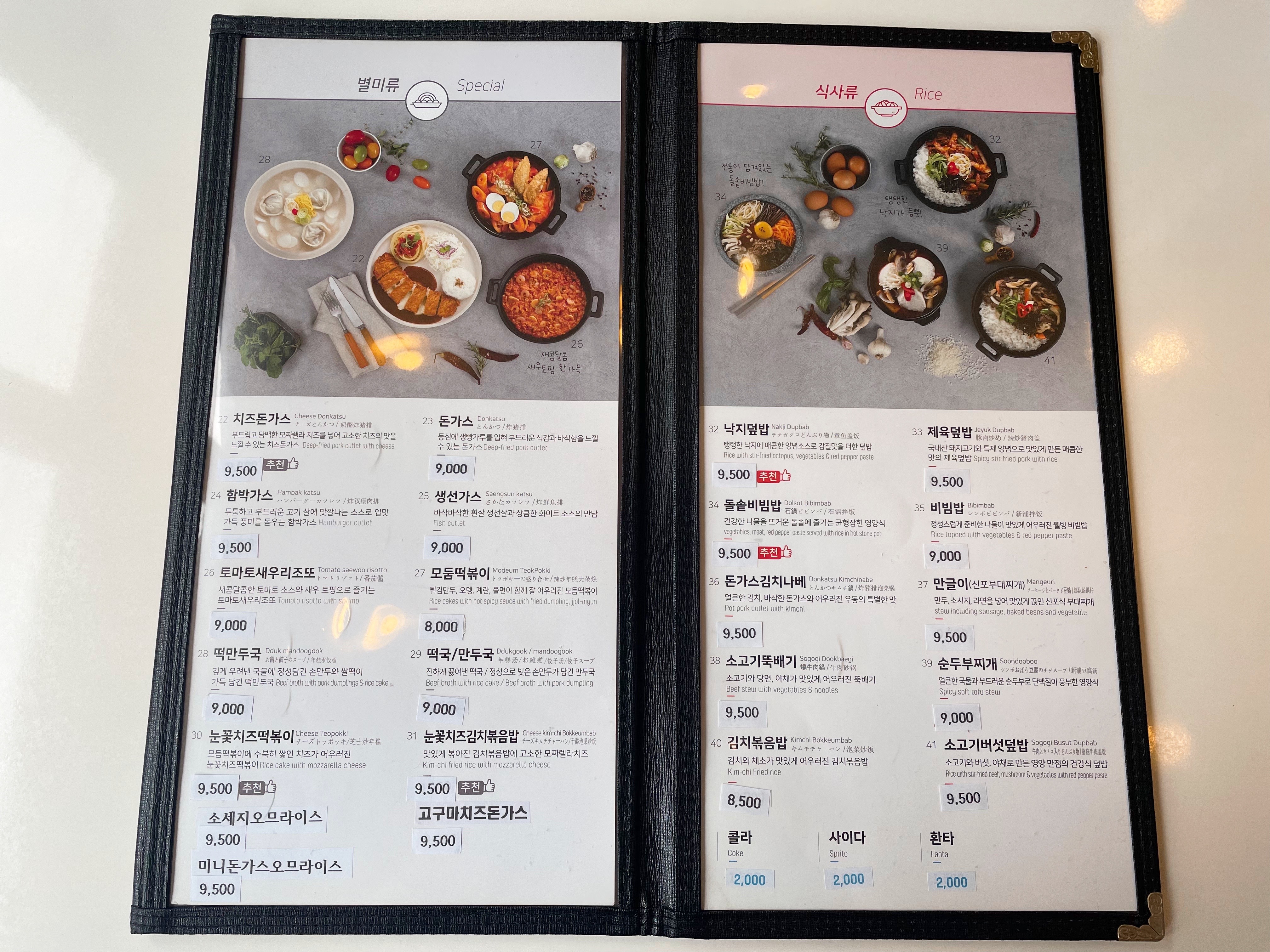 | ★ 치즈 돈가스(9,500원) 함박 가스(9,500원) 토마토 새우 리조또(9,000원) 떡만두국(9,000원) ★ 눈꽃 치즈 떡볶이(9,500원) 소세지 오므라이스(9,500원) 미니 돈까스 오므라이스(9,500원) 돈가스(9,000원) 생선가스(9,000원) 모둠 떡볶이(8,000원) 떡국/만두국(9,000원) ★ 눈꽃 치즈 김치 볶음밥(9,500원) 고구마 치즈 돈가스(9,500원) |
