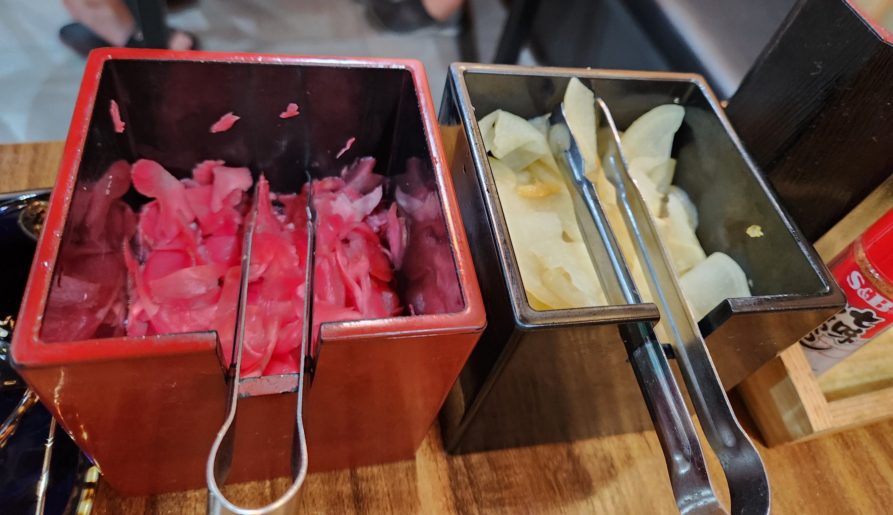 테이블마다 생강절임과 단무지를 덜어먹을 수 있게 준비해 뒀다.