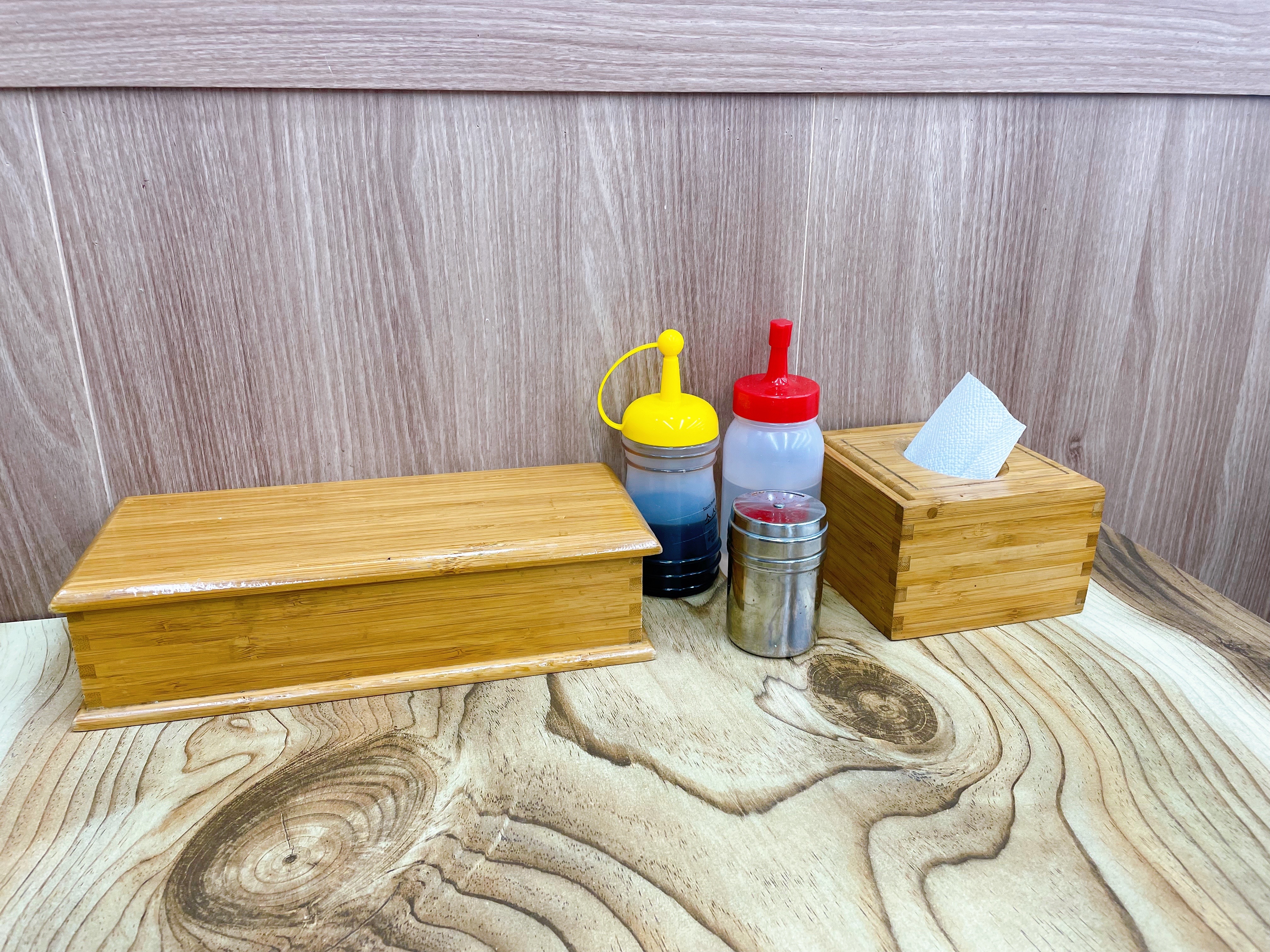 자리에는 티슈, 간장, 식초, 고춧가루가 있다.