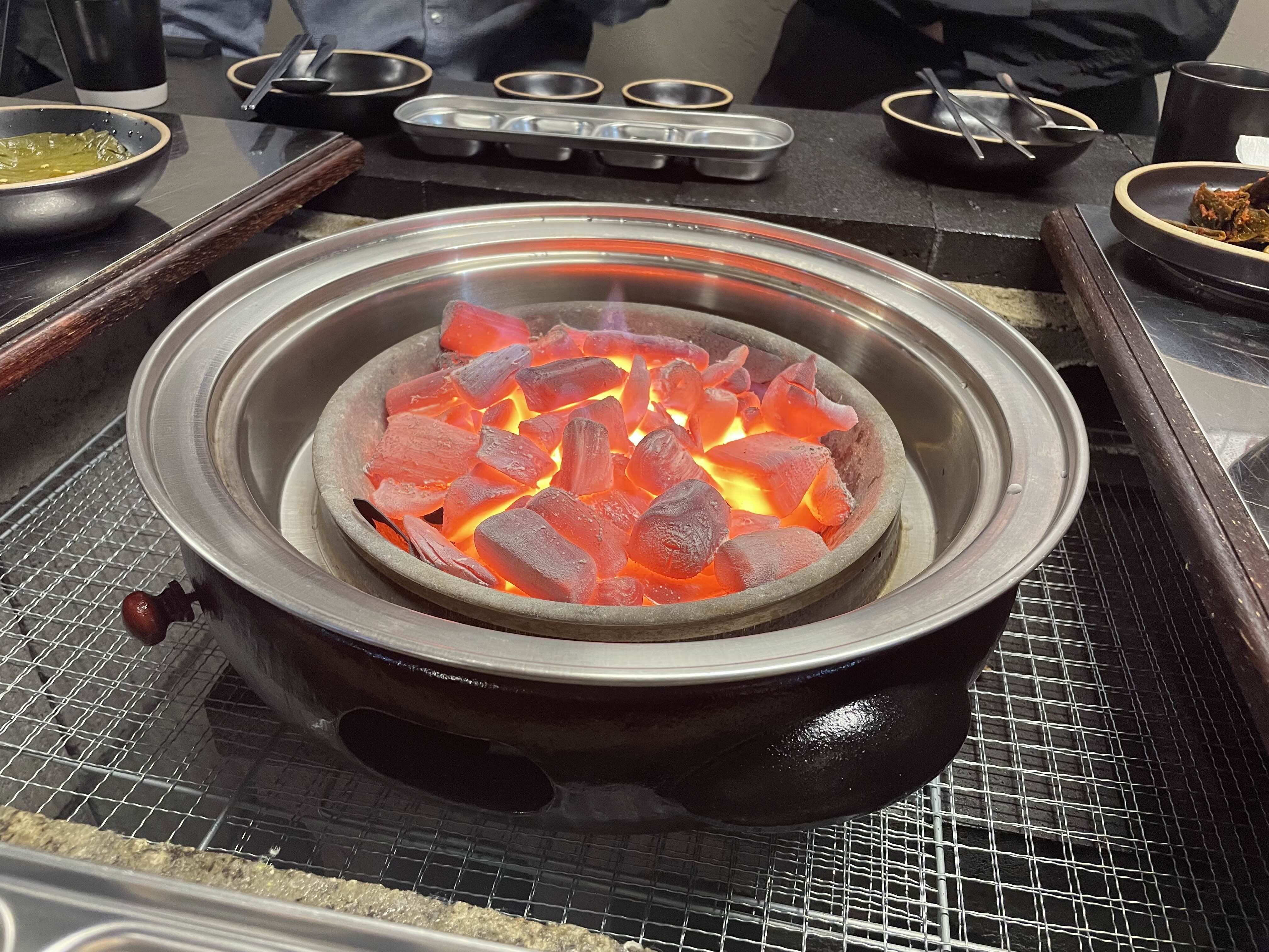 철망 위에 뚝배기 같은 화로가 얹어져 있다.